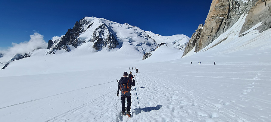 L'approche sur le glacier nous fera passer autour de quelques crevasses. A notre droite le Mont Blanc du Tacul nous fera de l'oeil. Sûrement un prochain objectif, c'est souvent la suite logique à notre course.