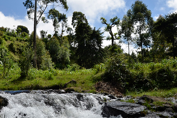 Aujourd’hui, le sentier nous mène à travers les villages de basse montagne et à l’intérieur de la forêt. Nous traversons des rivières sur des petits ponts de bois, sautons de pierres en pierres pour atteindre l’autre berge. Après 5km de marche nous découvrons les canaux d’irrigation traditionnels utilisés depuis plus de 100 ans. Grâce à eux les fermiers développent la culture du café, des bananes et de beaucoup d’autres fruits et légumes. Après avoir longé la vallée donnant sur la rivière Rau, nous apercevons une immense cascade. Avant d’arriver au campement, la dernière montée nous demande un ultime effort.