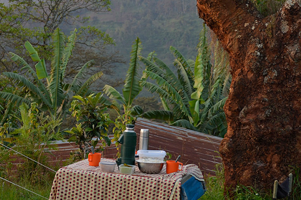 Notre premier campement est installé sur les terres de Simon, le fondateur de SÉNÉ. Alors que le soleil se couche, nous pouvons apercevoir les lumières de la ville de Moshi en contrebas tout en écoutant le silence de la montagne.
